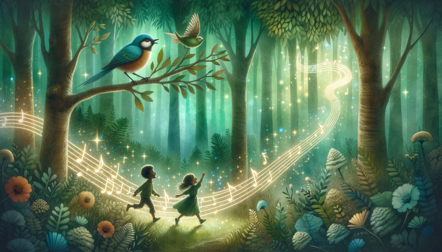 Egy forró, fülledt délután, amikor a levegő is szinte megállt, és még a fák is lehajtották ágaikat a hőségtől, Árpi és Jázmin a kút mellett üldögéltek. Hirtelen egy lágy, édes dallam csengett fel a közeli erdő felől. Olyan volt, mintha ezer apró harangocska szólna egyszerre, de mégis egyetlen, összefüggő, csodálatos énekké fonódott. A gyermekek elnémultak, lélegzetük is elállt a meglepetéstől.