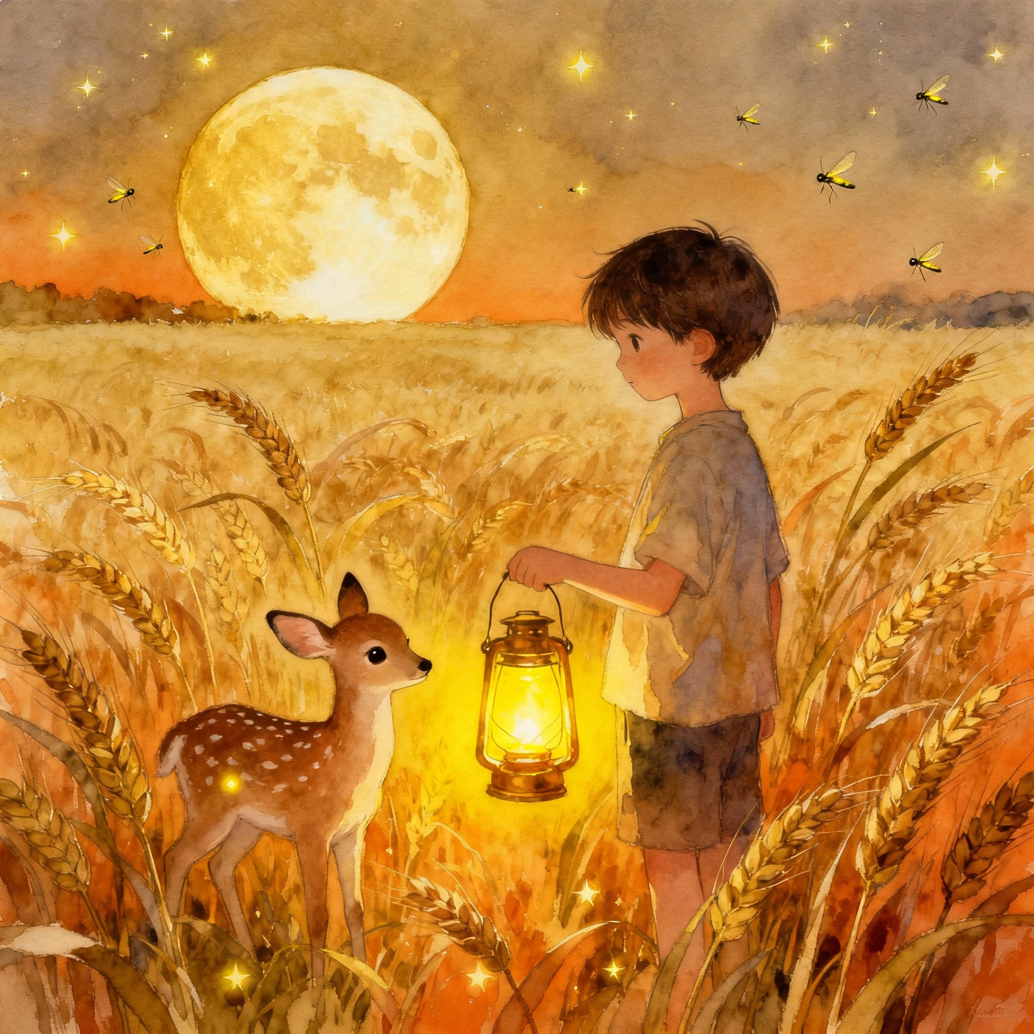 Amikor az aratóhold már magasan járt az égen, és ezüstös fénnyel árasztotta el a tájat, a falu népe elkészült. Száz meg száz lámpás világított Nagyi udvarában, mint megannyi apró csillag. Zétény büszkén tartotta a saját, kicsit ferde, de annál fényesebb lámpását. Nagyi a keze ügyében tartotta a legszebbet, egy borostyánszínű üvegből készültet.