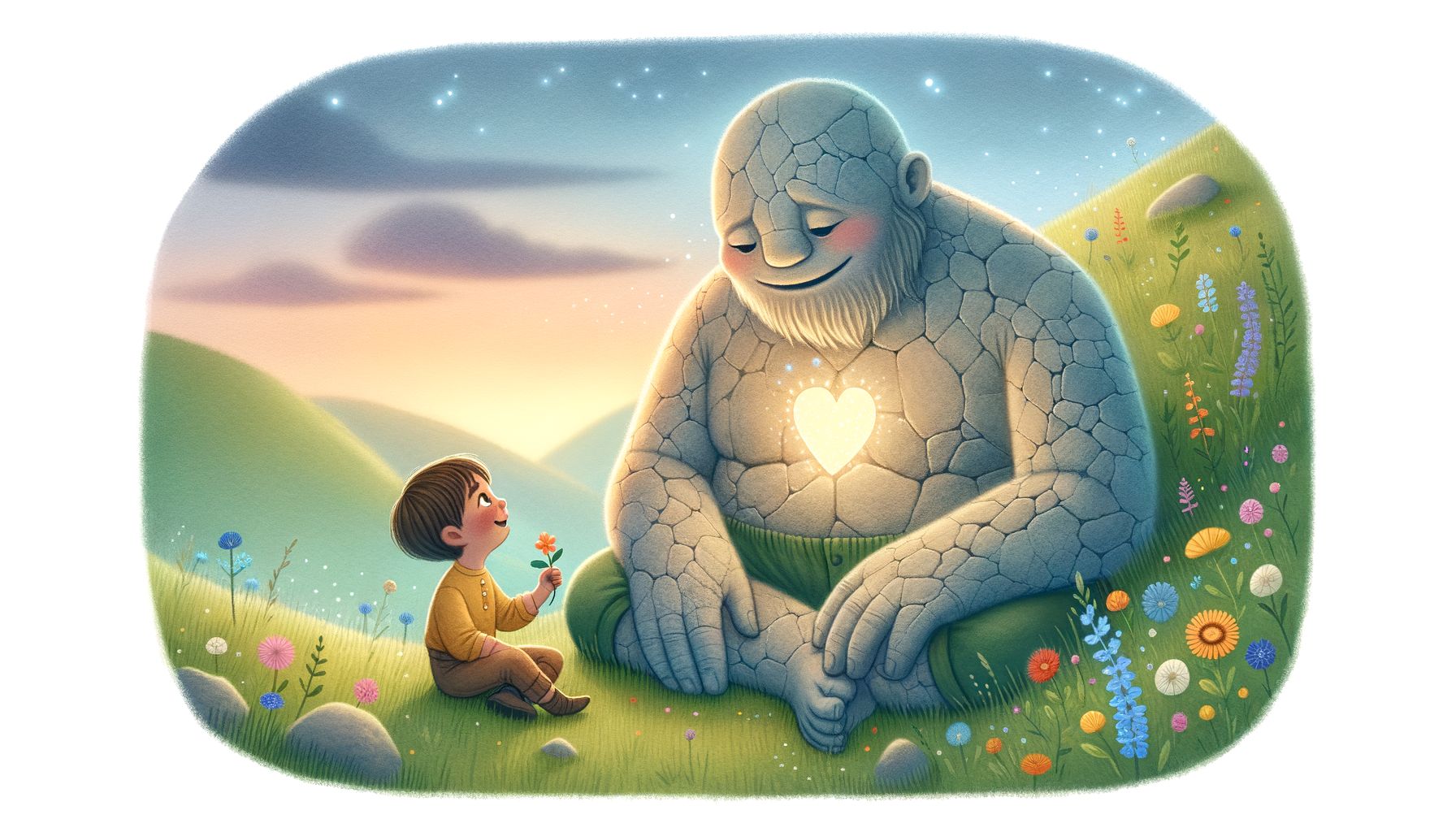 Az Óriás nem válaszolt. Bálint leült mellé a földre, és elkezdett mesélni. Mesélt a faluról, a gyerekek játékairól, a napfényes rétekről, a csillagos éjszakákról. Mesélt a barátságról, arról, hogy milyen jó, ha van valaki, akivel megoszthatod az örömödet és a bánatodat. Az Óriás hallgatott. Néha egy-egy apró mozdulattal jelezte, hogy figyel. Bálint nem erőltetett semmit, csak mesélt és mesélt, a szíve mélyéről jövő őszinte kedvességgel.