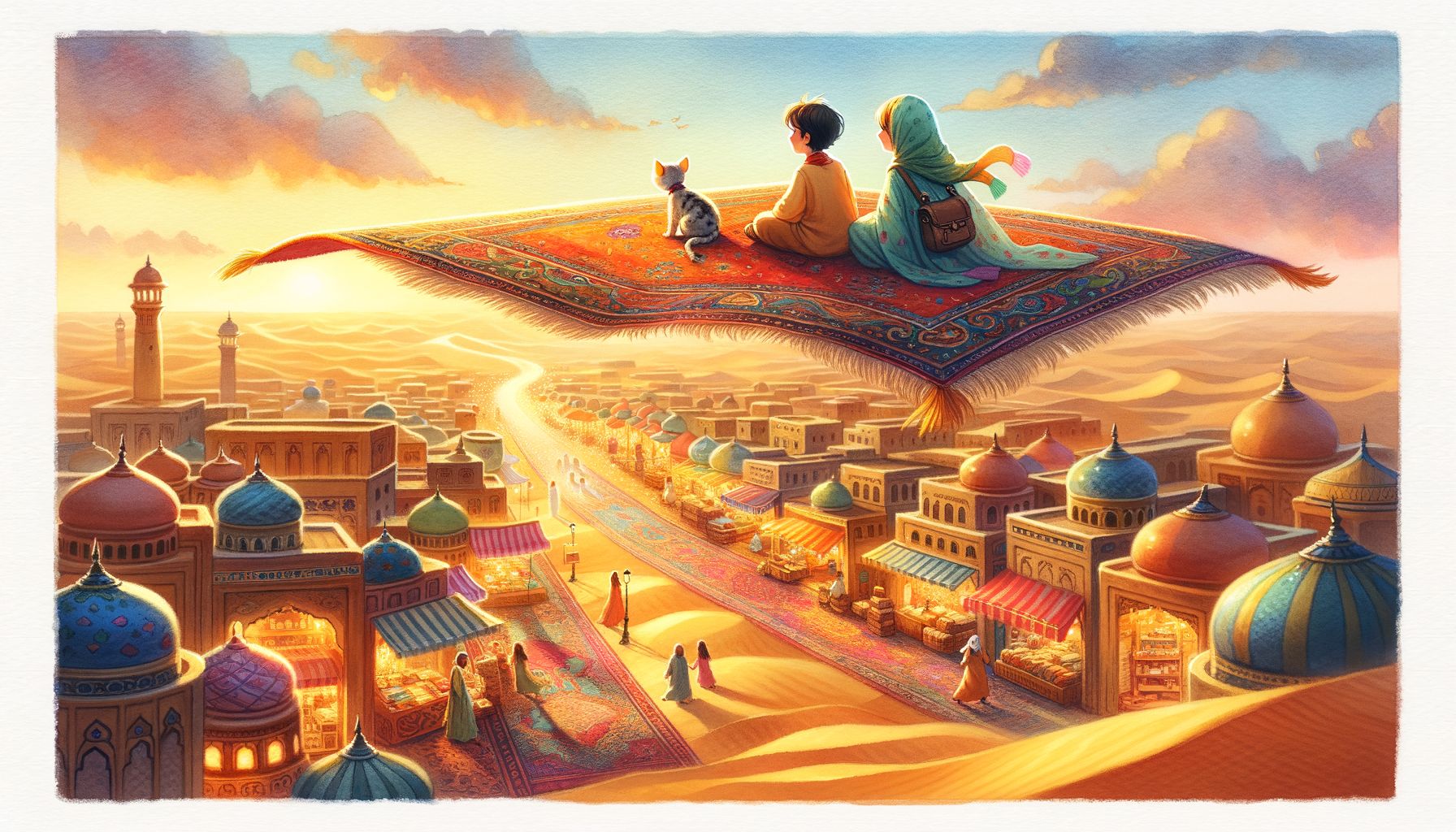 Az első város, amit Amír meglátogatott, a „Fűszerek Városa” volt. Az éjszakai égbolton sárgásan és vörösen vibráltak a fények, és a levegőben édes, csípős illatok keveréke úszott. A szőnyeg óvatosan ereszkedett le egy csendes tetőre. Amír lecsúszott róla, és elindult felfedezni. A piacokon emberek nyüzsögtek, selyemkelmék lobogtak a szélben, és ezüst ékszerek csillogtak a lámpások fényében. Amír sétált, nézelődött, és minden új látványtól elállt a lélegzete. De ahogy a nap felkelt, és a város ébredezett, Amír egyre magányosabbnak érezte magát. Kivel oszthatná meg ezt a sok csodát? Kinek mesélhetné el, milyen illatosak a fűszerek, milyen gyönyörűek a selymek?