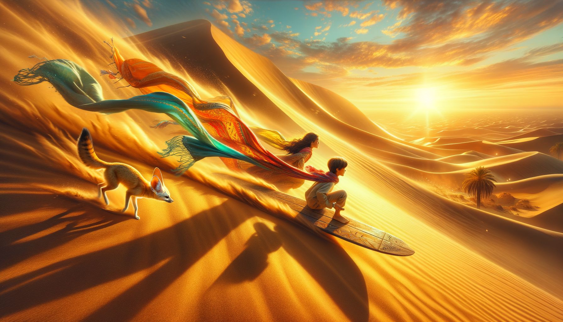 Fátyol, a sivatagi szél, mintha örült volna a játékos kihívásnak. Felerősödött, hol a gyerekek mögé kapva, hol oldalról lökdösve őket, mintha megpróbálná megelőzni őket. A homokszánok száguldottak, a levegő süvített a fülük mellett, a homok pedig aranyszínű hullámokban, mint egy folyó, hömpölygött a lábuk alatt. Dávid és Sára kacagva kapaszkodtak, érezték a szabadságot, a sebességet, és a sivatag hatalmas, pulzáló szívét.