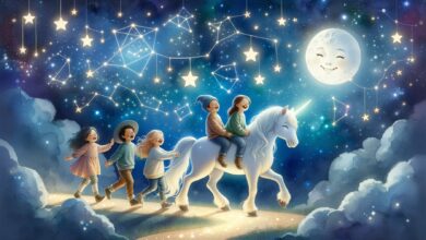„Most pedig, csillagpor, segíts nekünk!” – Lilla egy marék csillámport szórt az Álmunikornis sörényére. A szoba falai áttetszővé váltak, majd eltűntek, és Misi hirtelen a csillagos ég alatt találta magát. Az Álmunikornis könnyedén siklott a levegőben, a csillagok között, mintha egy mézszínű folyón úsznának. A Tejút fényesen ragyogott felettük, és Misi úgy érezte, mintha ő is egy csillag lenne a sok közül.
