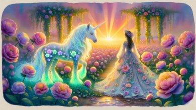 „Készen, Szundimanó, de előbb szükségünk van a mi hűséges társunkra is!” – mondta Lilla, és meglengette vékony, fénylő pálcáját. A szoba megtelt lágy, ezüstös fénnyel. A fényből egy mesés lény lépett elő: az Álmunikornis. Szőre olyan fehér volt, mint a frissen hullott hó, sörénye és farka a szivárvány színeiben pompázott, mintha a naplemente színei fonódtak volna bele. Szarva úgy csillogott, mint a hajnali harmatcsepp a napfényben, szemei pedig bölcsességet és kedvességet sugároztak. Misi sosem látott még ilyen gyönyörű lényt.