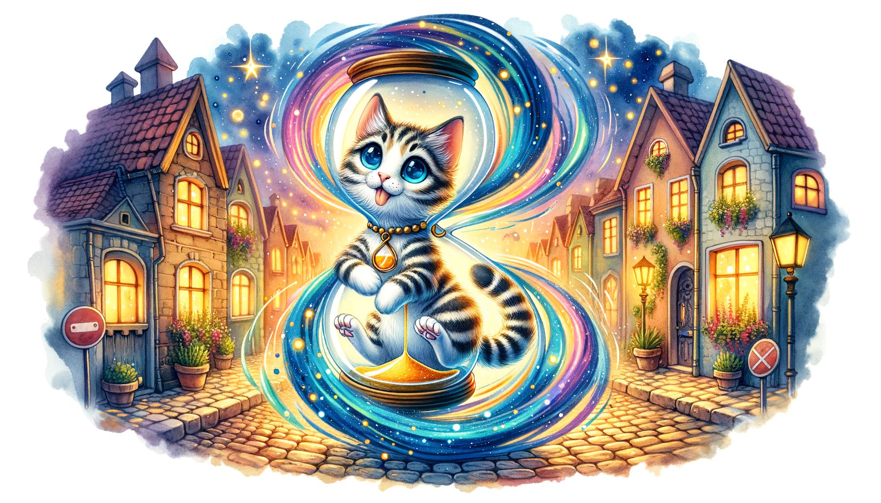 Volt egyszer, hol nem volt, a világ egy csendes, napsütötte sarkában, ahol a virágok mindig illatosak voltak, és a madarak a legszebb dallamokat fütyülték, élt egy különleges cica. Csiribiri volt a neve, és a bundája olyan volt, mintha a naplemente csíkjait hordozná magán: aranybarna, fekete és fehér foltok játékos keveréke. De nem csak a bundája tette különlegessé. A nyakában, egy finom bőrszíjon, egy apró, csillogó homokóra lógott, ami a legelképesztőbb titkot rejtette: Csiribiri képes volt vele ugrálni az időben.