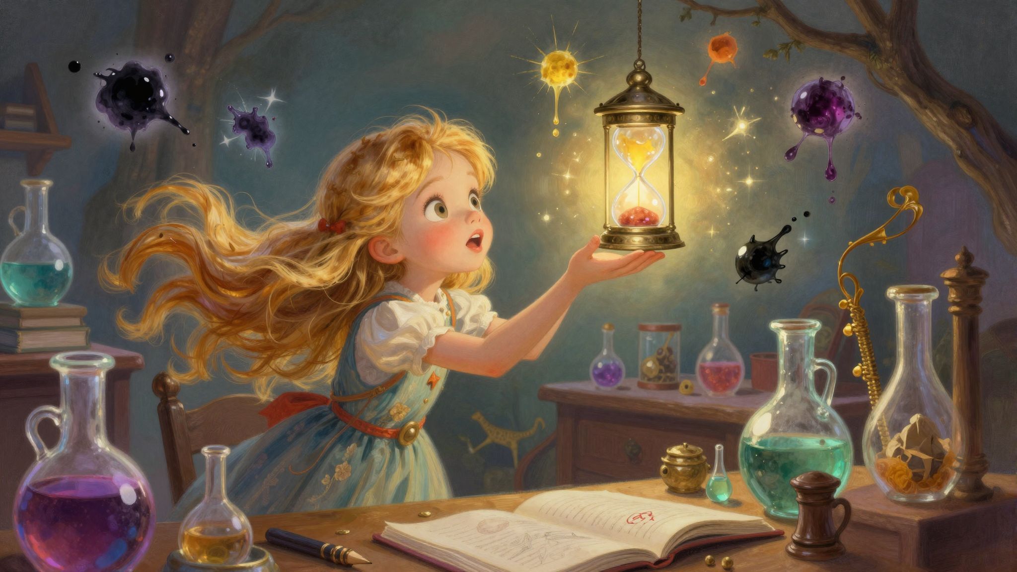 Mária óvatosan kivett egy csipetnyit a porból, és a lámpás lángja felé szórta. Ezzel egy időben egy békés, tiszta gondolatot küldött a lámpás felé: a biztonságról, a védelemről, és arról, hogy az iskola otthon legyen mindenki számára. A Csillámpor szikrázva szállt a láng felé, és amint elérte, a lámpás lángja hirtelen felélénkült. Először csak egy kicsit, aztán egyre erősebben, míg végül olyan fényesen ragyogott, mint a hajnali nap. A lámpás körül ülő porszemek is táncba kezdtek, örömteli keringőre perdültek a megújult fényben.