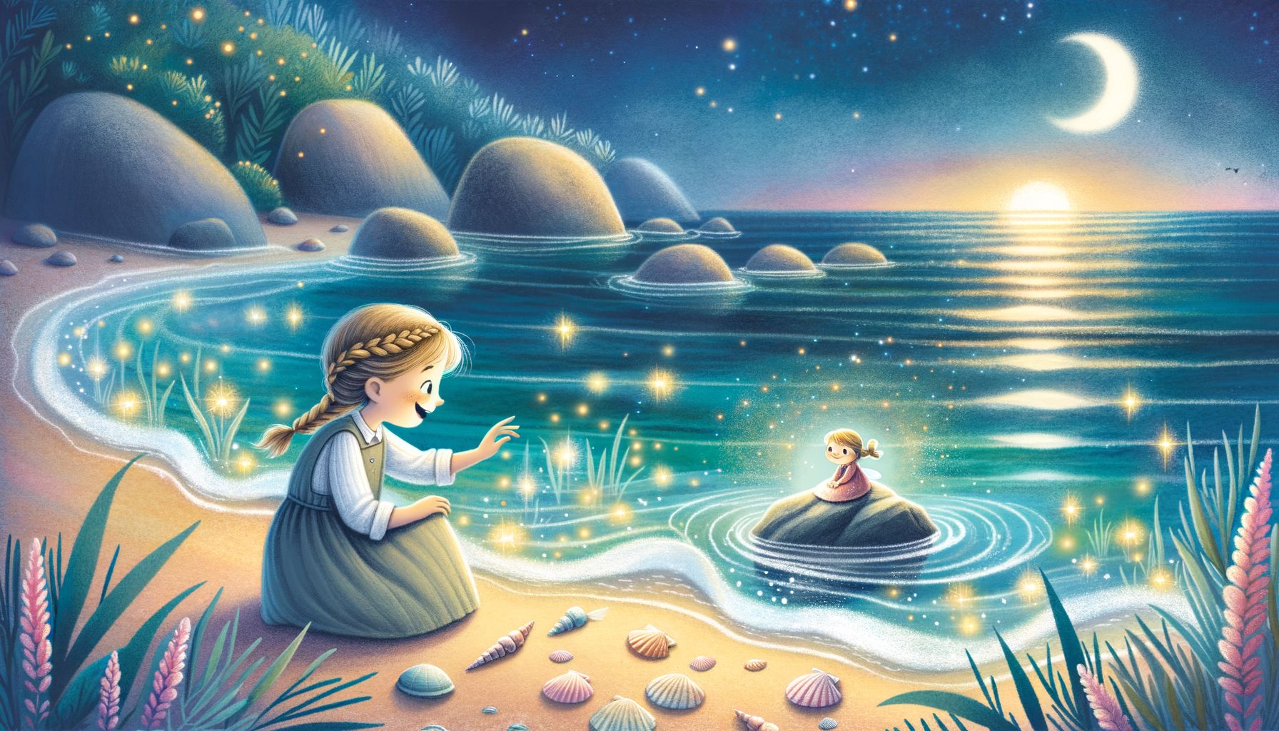 Volt egyszer, hol nem volt, a tengerparton, ahol a kagylók suttogták a régi meséket a szélnek, élt egy kislány, akinek a szíve éppoly tiszta volt, mint a legfényesebb nyári ég. Móninak hívták, és minden nap, amint a nap első sugarai megcsókolták a habokat, ő már ott is volt a parton. Nem homokvárat épített, nem is kavicsokat gyűjtött, hanem a tenger titkait leste. Ült a meleg homokban, fülelt, és képzeletében mélyre merült a hullámok alá, ahol csillogó halak és rejtelmes lények élnek.