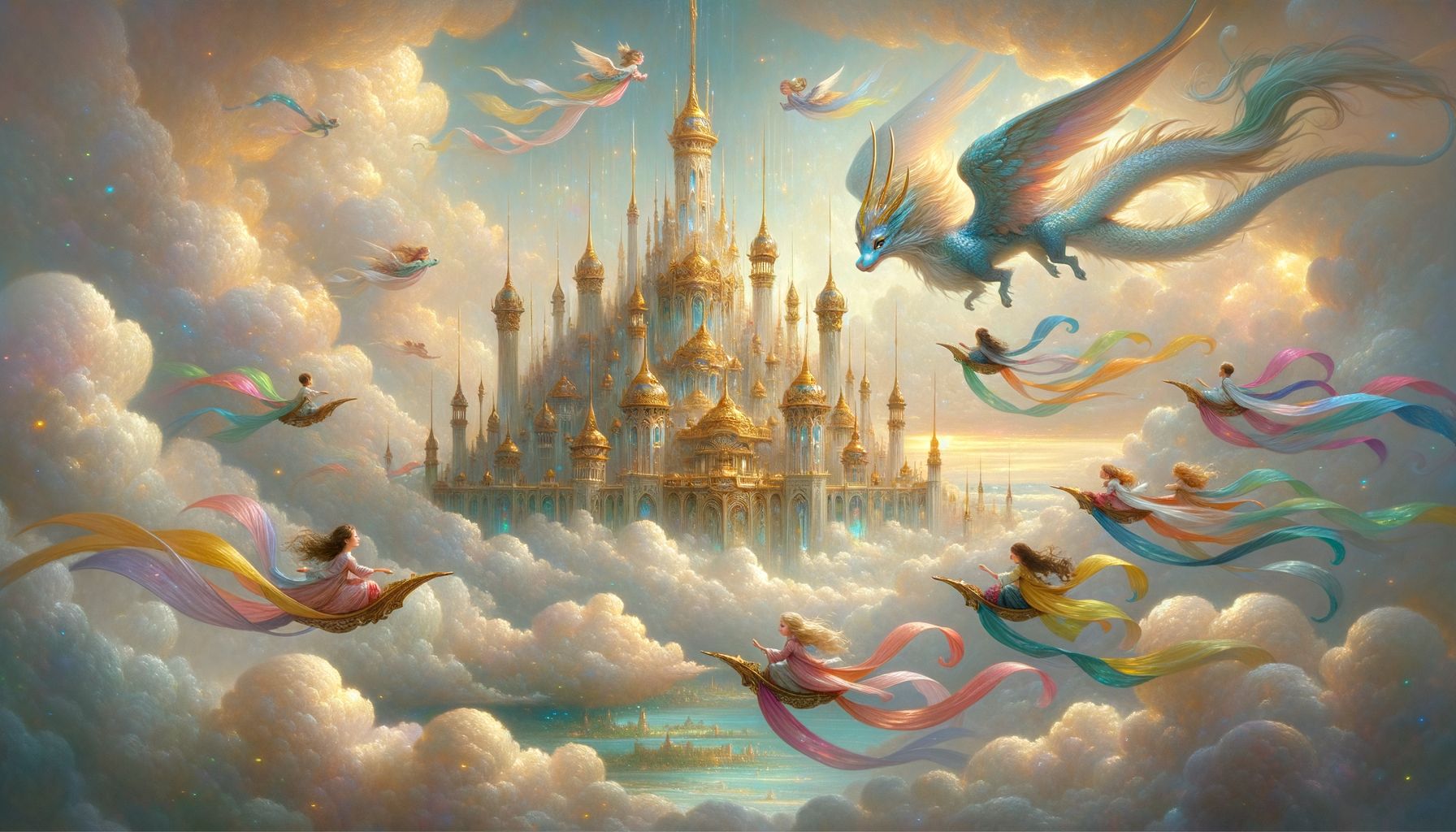 A palota kapujában egy magas, méltóságteljes alak állt. Arca nem volt, csak ragyogó fény, a köpenye pedig finom ködszálakból szövődött. Ő volt a Felhőpalota őre.